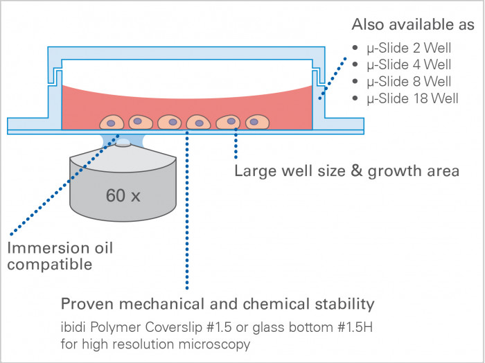 • 帶有1個大孔的腔室載玻片,用于活細胞成像、免疫熒光和高分辨率(polymer聚合物塑料底)/超高分辨(玻璃底)顯微鏡成像: